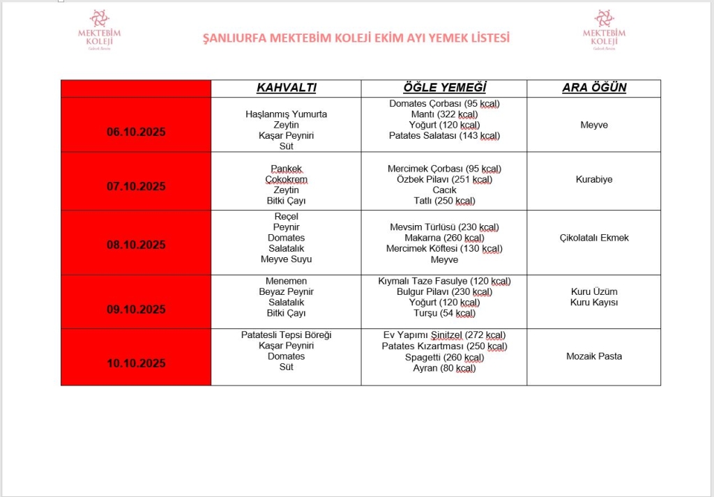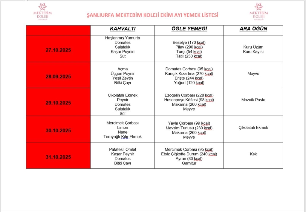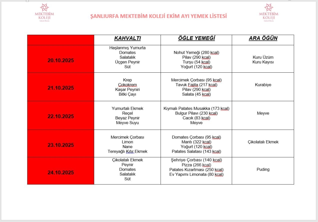 EKİM AYI YEMEK MENÜSÜ